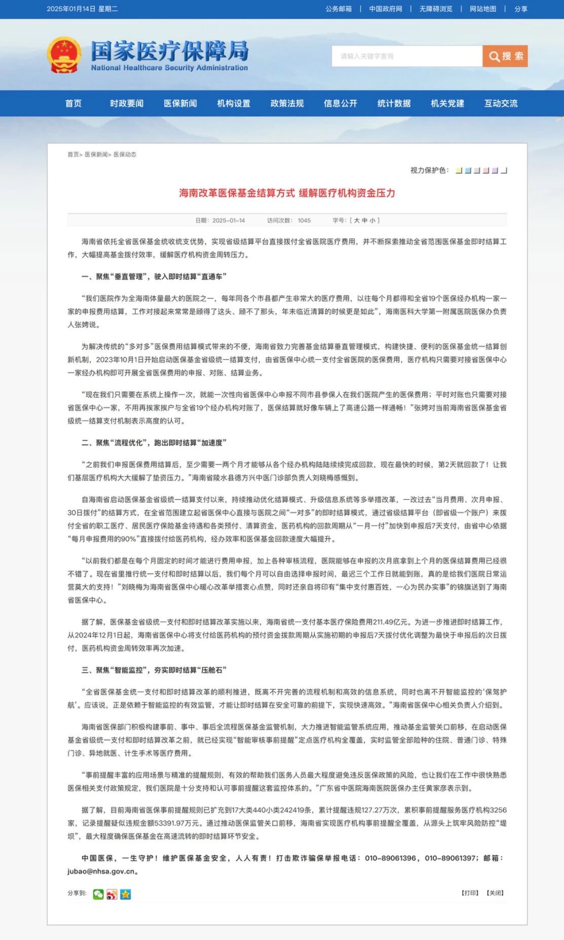 海南省醫保部門構建了事前、事中、事后全流程醫保基金監管機制,大力推進智能監管系統應用。在啟動醫?;鹗〖壗y一支付和即時結算改革之前,海南已實現“智能審核事前提醒”定點醫療機構全覆蓋,實時監管全部險種的住院、普通門診、特殊門診、異地就醫、計生手術等醫療費用。