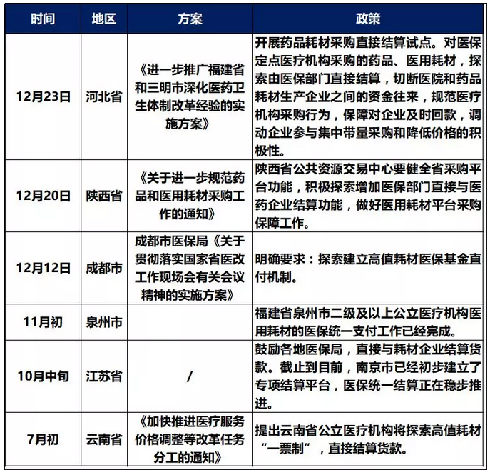 2019年3月20日,福建省才在在2019年工作計劃中明確提出:探索醫療器械(醫用耗材)統一結算。計劃剛出臺,緊接著4月福建首個試點市——泉州試點落地!