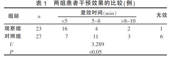 1.3 效果評價 觀察干預顯效時間、手術時間、術后出血量及填塞物留置時間等情況。干預效果評價:顯效為干預后出血控制,無效為干預后出血未能控制。出血控制為子宮逐漸收縮,硬度增加,陰道流血停止,生命體征平穩。填塞完畢立即觀察陰道流血情況,以計算顯效時間及判斷止血效果,若填塞后陰道流血量逐漸減少,說明開始顯效。