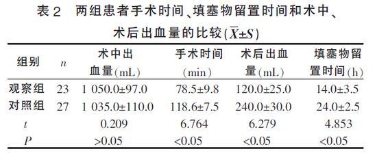 2.2 兩組患者手術時間、填塞物留置時間和術中、術后出血量的比較 兩組患者均無死亡,術中出血量比較差異無統計學意義(P>0.05),觀察組手術時間、術后出血量及填塞物留置時間均少于對照組,兩組間比較差異有統計學意義(P<0.05),觀察組術后2 例體溫為37.5-38.6℃,持續2 d;對照組術后體溫>39.3℃患者6例,拔出紗條后恢復至正常見表2