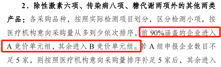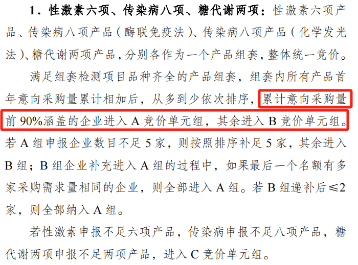 根據(jù)公告,本次聯(lián)盟集采將單檢測項目或組套檢測項目品種齊全項目按醫(yī)療機(jī)構(gòu)意向采購量分為 A、B 兩個競價單元,性激素六項、傳染病八項、糖代謝兩項三類產(chǎn)品分別按組套采購。