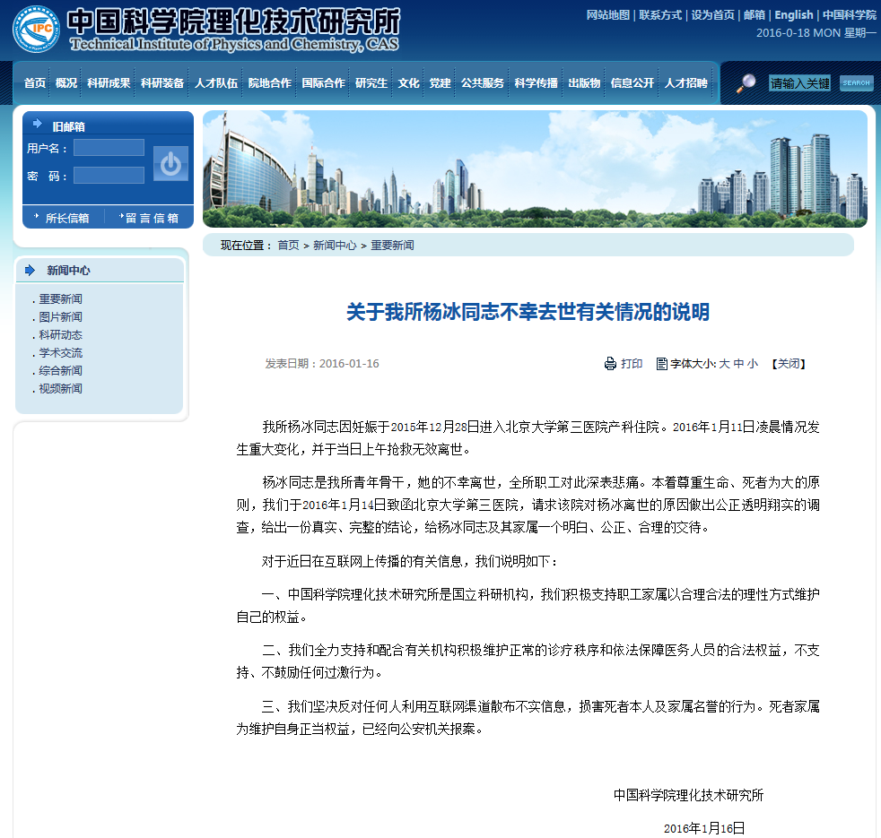 幾乎同時,患者生前所在單位中科院理化所也發布了《關于我所楊冰同志不幸去世有關情況的說明》。