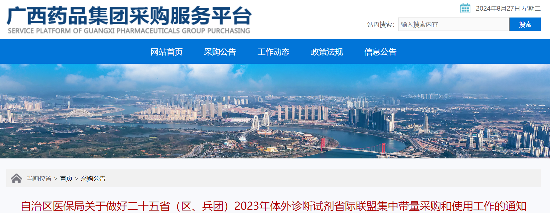 8月26日,廣西壯族自治區(qū)醫(yī)保局發(fā)布《自治區(qū)醫(yī)保局關(guān)于做好二十五省(區(qū)、兵團(tuán))2023年體外診斷試劑省際聯(lián)盟集中帶量采購(gòu)和使用工作的通知》。