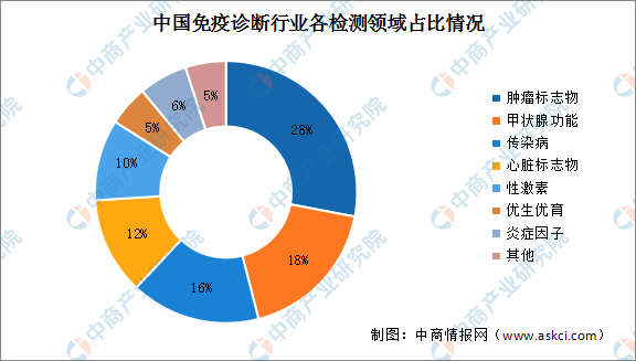 根據(jù)中商產(chǎn)業(yè)研究院統(tǒng)計(jì),從免疫診斷行業(yè)各個(gè)細(xì)分市場(chǎng)來(lái)看,腫瘤標(biāo)志物檢測(cè)、甲狀腺功能檢測(cè)和傳染病檢測(cè)是我國(guó)免疫診斷項(xiàng)目中,規(guī)模排名前三的領(lǐng)域。其中腫瘤標(biāo)志物檢測(cè)項(xiàng)目市場(chǎng)最大,占比達(dá)到28%。