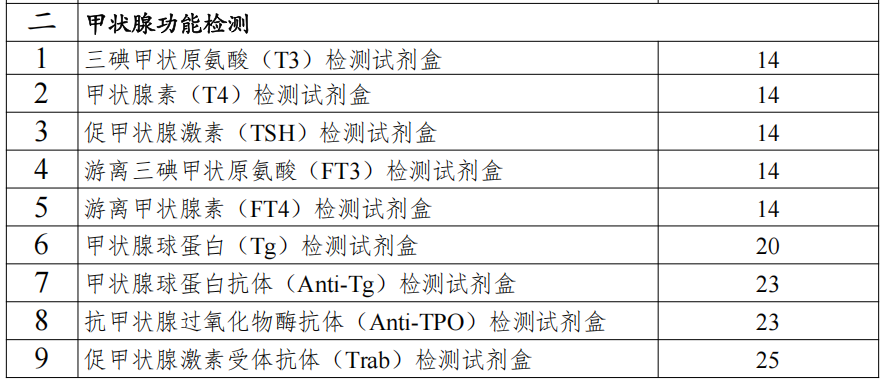 據統計,此次腫標檢測試劑意向采購量約為2.7億人份,首年意向采購量約為2.4億人份;甲功檢測試劑意向采購量約為3.3億人份,首年意向采購量為約3億人份。各集采項目具體情況如下: