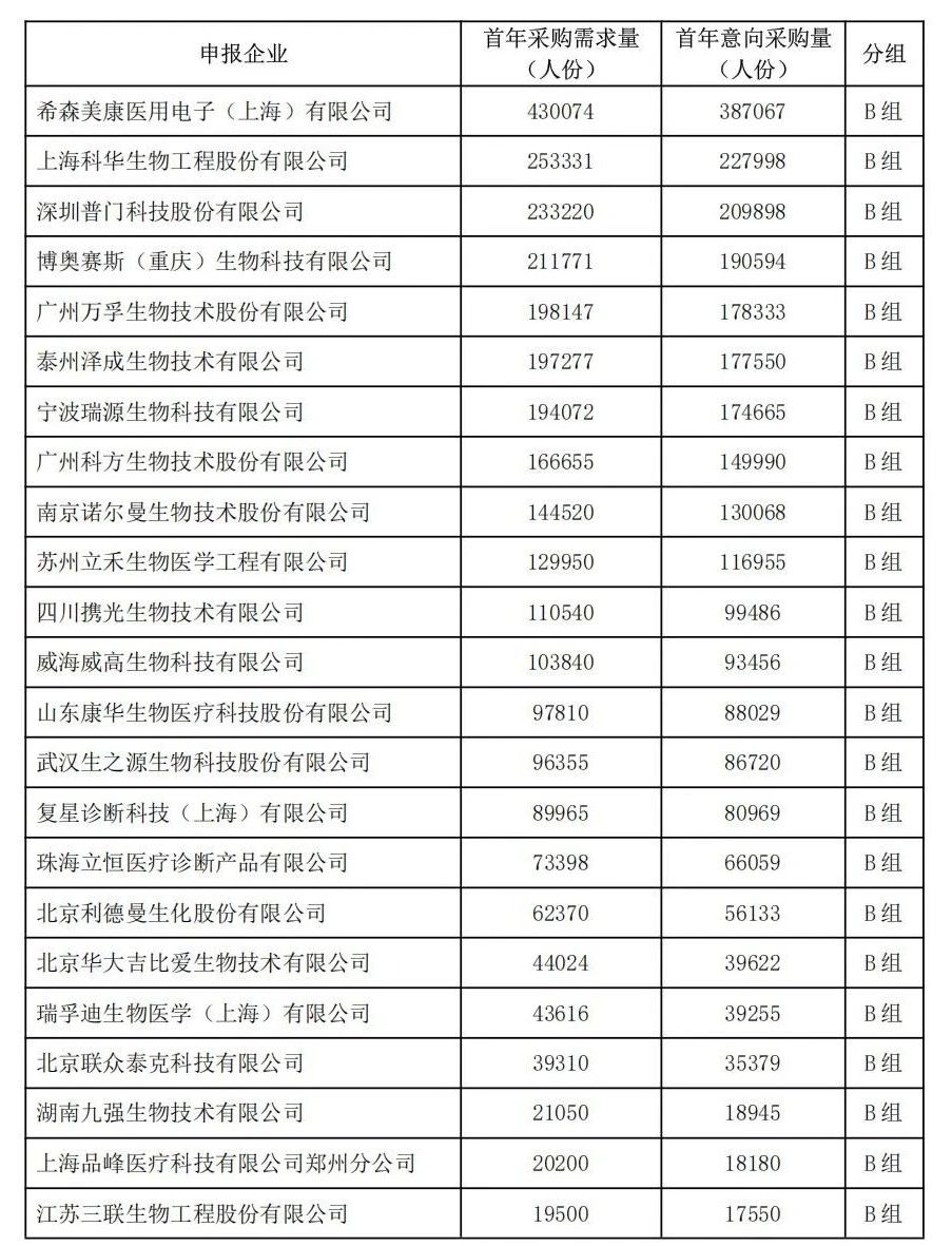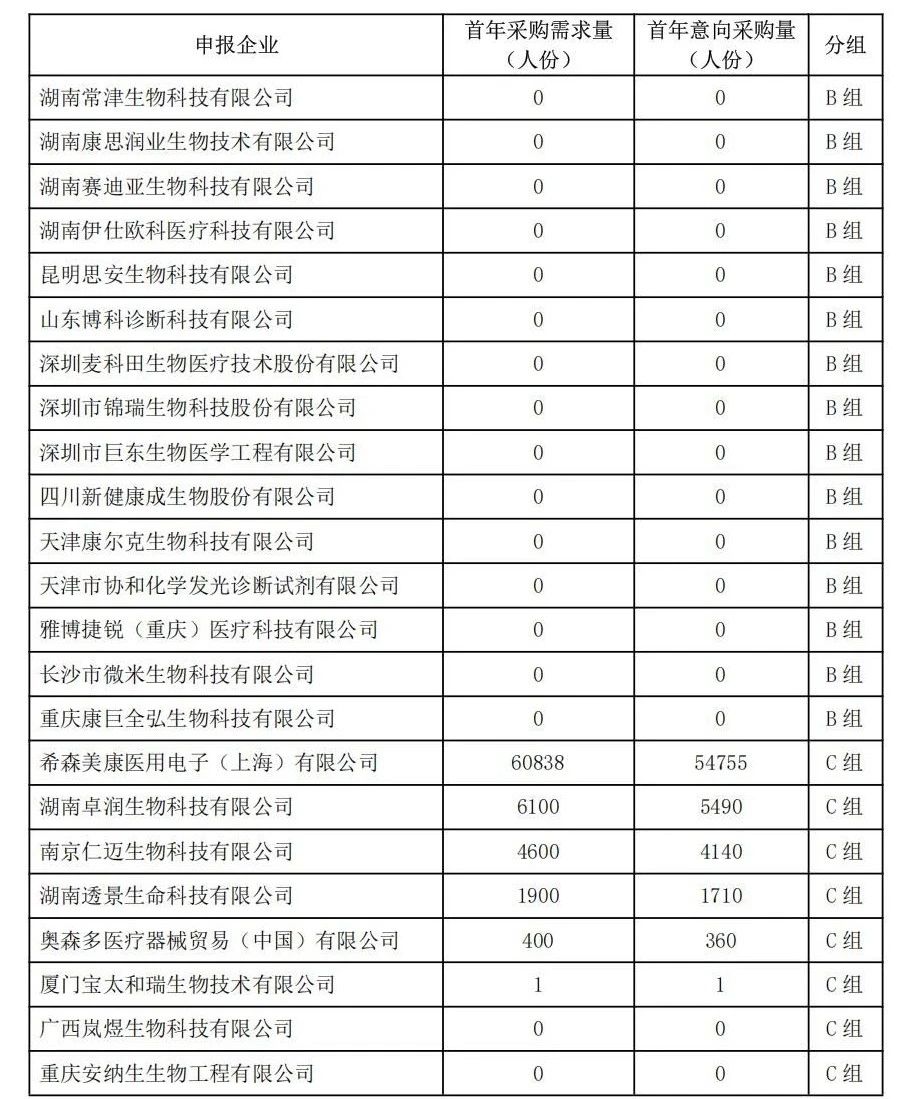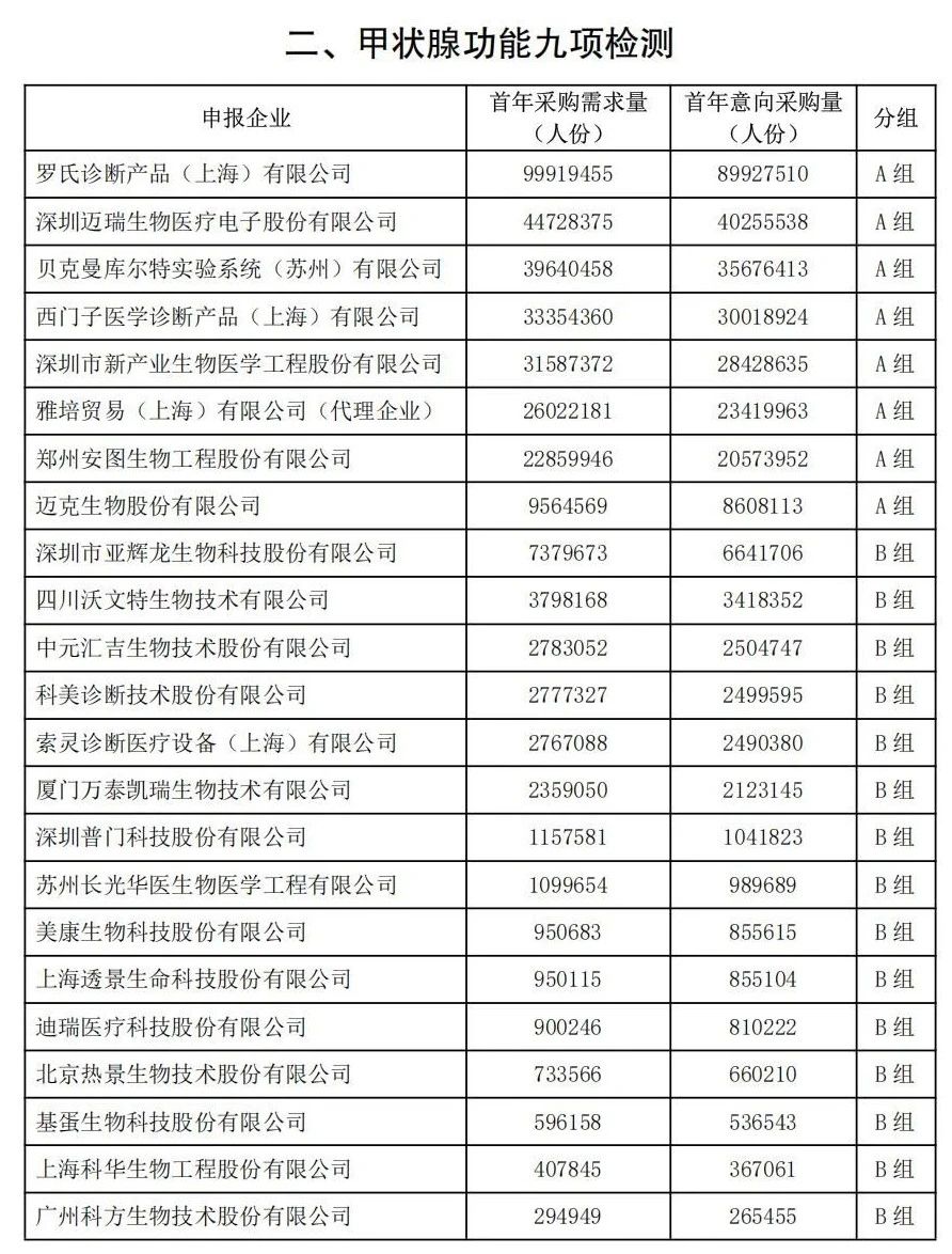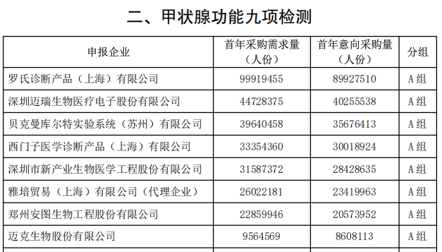 甲狀腺功能檢測試共96家企業參與競價,其中8家企業進入A組,按首年采購需求量排序為,羅氏診斷、邁瑞、貝克曼、西門子、新產業、雅培、安圖生物、邁克生物,外資國產均占半數,且亞輝龍為B組第一,首年意向采購需求、采購量同樣可觀。