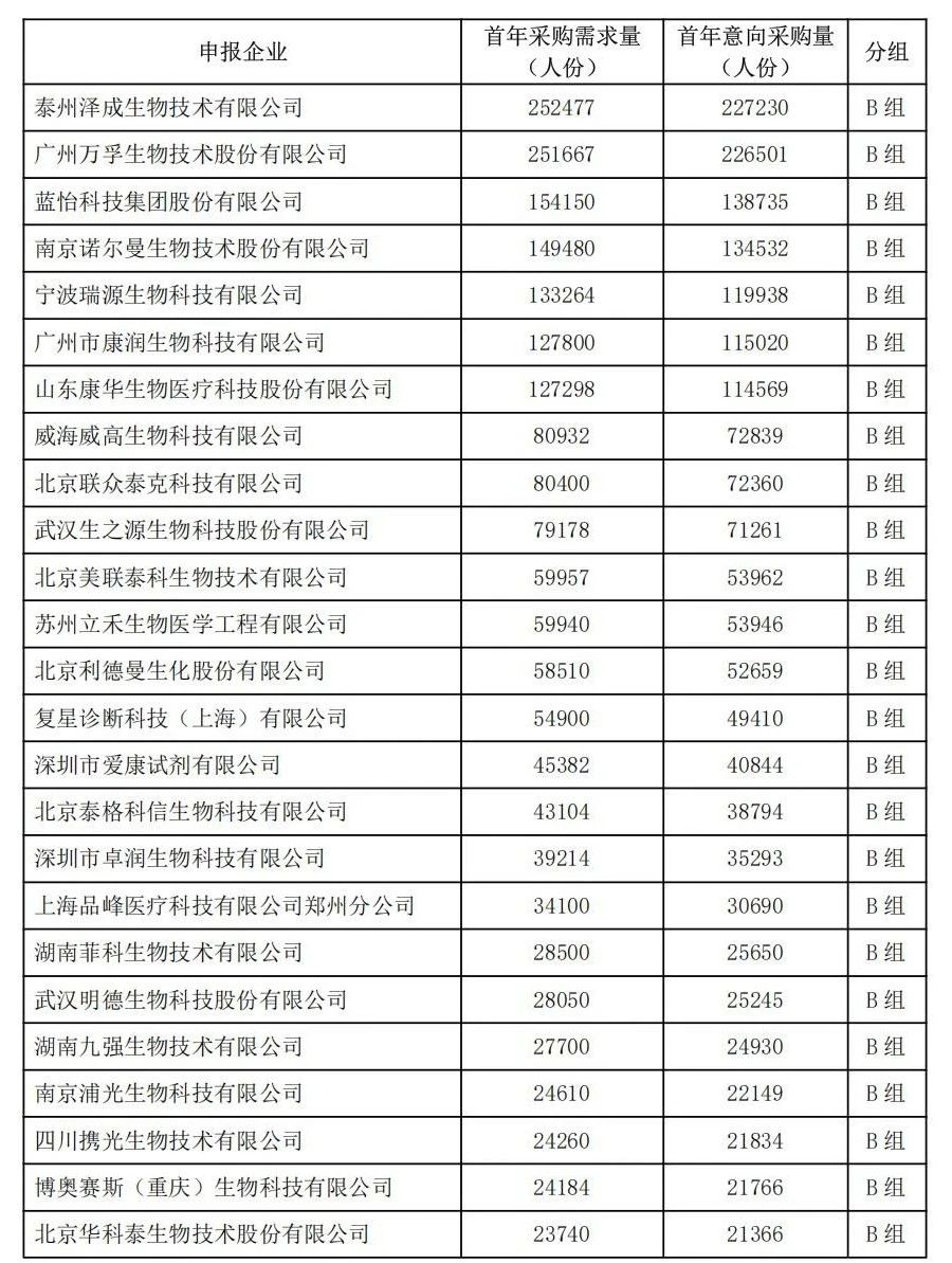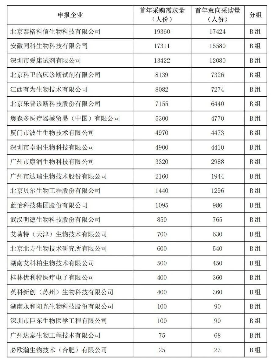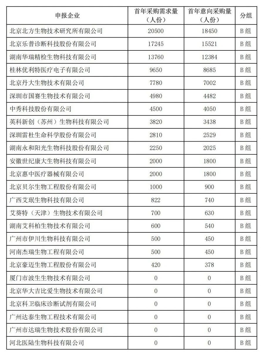 甲狀腺功能檢測試共96家企業參與競價,其中8家企業進入A組,按首年采購需求量排序為,羅氏診斷、邁瑞、貝克曼、西門子、新產業、雅培、安圖生物、邁克生物,外資國產均占半數,且亞輝龍為B組第一,首年意向采購需求、采購量同樣可觀。