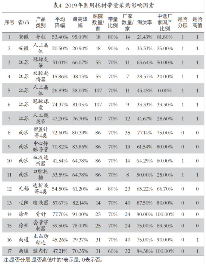 今年年初,首都醫科大學國家醫療保障研究院副研究員蔣昌松曾在《中國醫療保險》中發布《醫用耗材帶量采購價格降幅影響因素分析及實證研究》,統計了2019年醫用耗材帶量采購影響因素,并進行回歸分析。