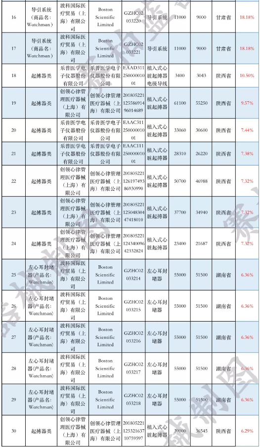 在降幅方面,導引系統平均降幅18.18%;左心耳封堵器平均降幅6.36%;起搏器類最低降幅2.04%,最高降幅22.72%(聯動省份為陜西省),平均降幅8.39%;