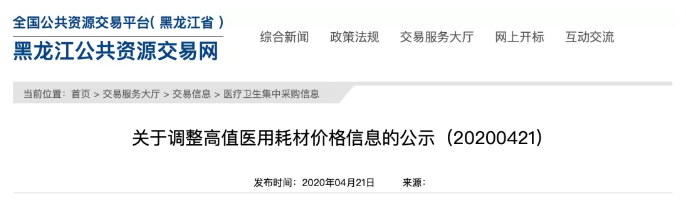 今日(4月21日), 黑龍江省醫療保障局在該省公共交易網發布了《關于調整高值醫用耗材價格信息的公示》,內容涉及高值耗材掛網產品價格聯動信息,以及省級中標(掛網)價申報價格信息。