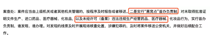 實行“黑窩點”首辦負責制。對未取得批準證明文件生產、進口醫療器械、及未經許可(備案)違法違規生產經營醫療器械行為,實行首辦負責制,誰發現、誰辦理。