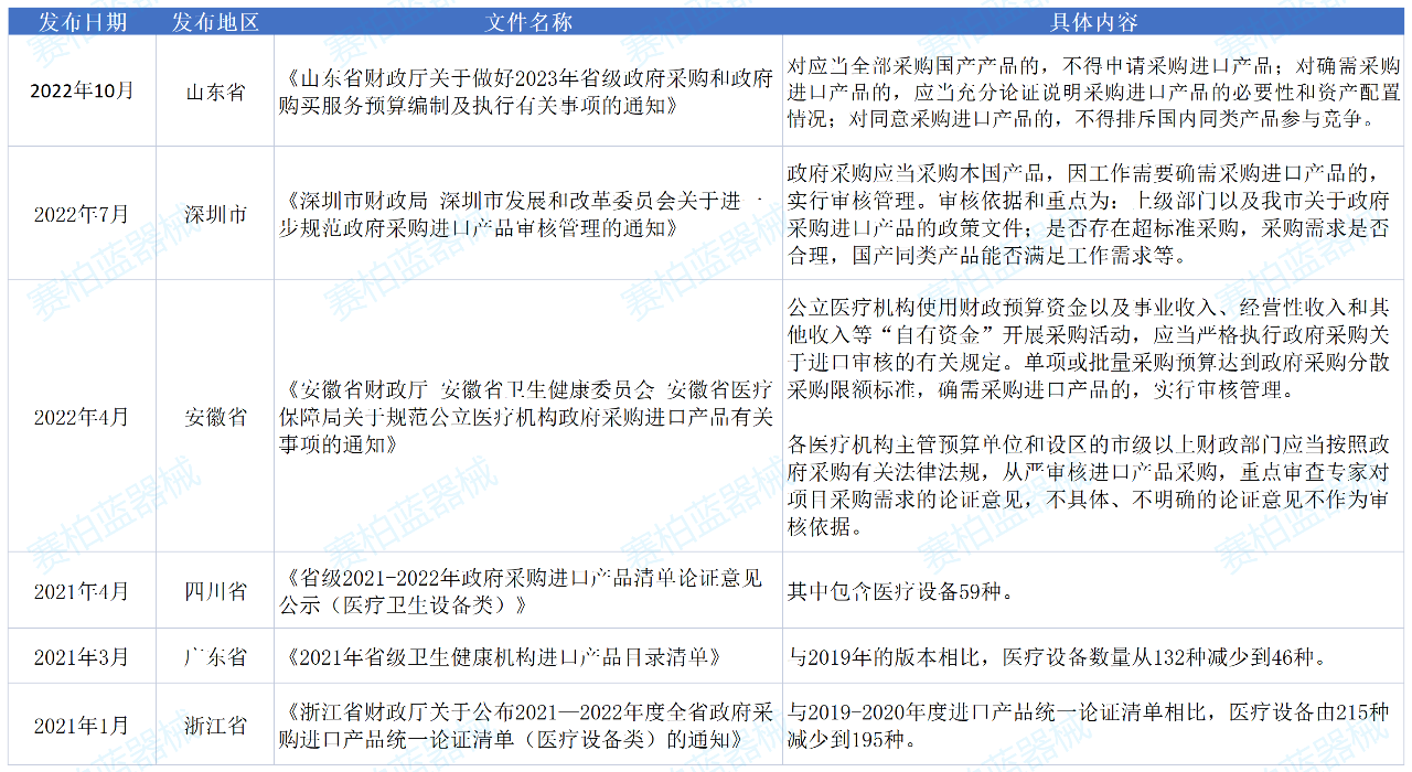 據(jù)賽柏藍器械觀察,近年來,全國多省市加強了醫(yī)療器械進口產(chǎn)品采購審批管理,申請采購進口設備需充分論證其必要性,部分地區(qū)還發(fā)布了新版進口產(chǎn)品統(tǒng)一論證清單。