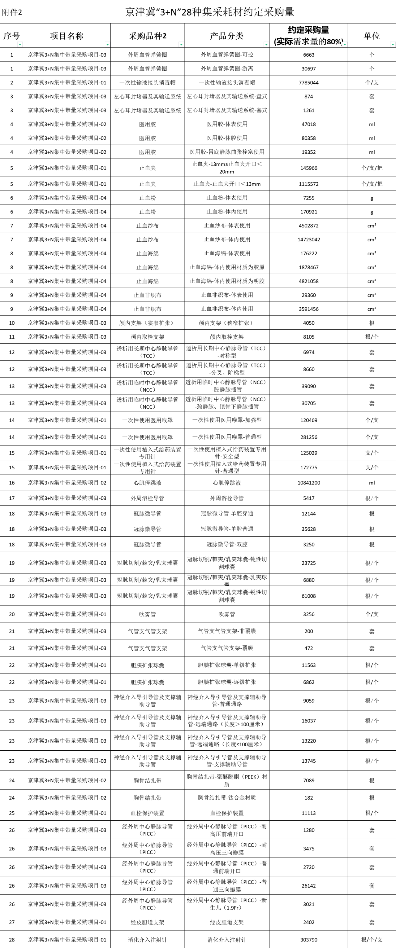 聯盟采購共包含28類耗材:外周血管彈簧圈、一次性輸液接頭消毒帽、左心耳封堵器及其輸送系統、醫用膠、止血夾、止血粉、止血紗布、止血海綿、止血非織布、顱內支架(狹窄擴張)、顱內取栓支架、透析用長期中心靜脈導管(TCC)、透析用臨時中心靜脈導管(NCC)、一次性使用醫用喉罩、一次性使用植入式給藥裝置專用針、心肌停跳液、外周溶栓導管、冠脈微導管、冠脈切割/棘突/乳突球囊、吹霧管、氣管支氣管支架、膽胰擴張球囊、神經介入導引導管及支撐輔助導管、胸骨結扎帶、血栓保護裝置、經外周中心靜脈導管(PICC)、經皮膽道支架、消化介入注射針。
