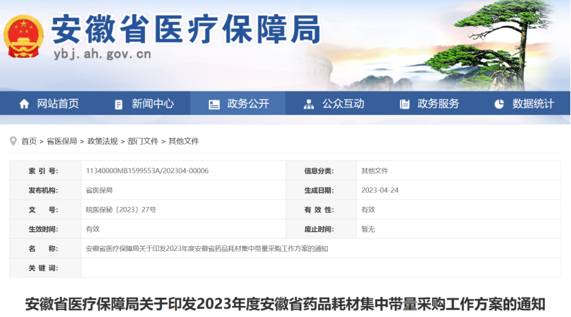 近期,安徽省醫保局發布《關于印發2023年度安徽省藥品耗材集中帶量采購工作方案的通知》(以下簡稱《通知》)。
