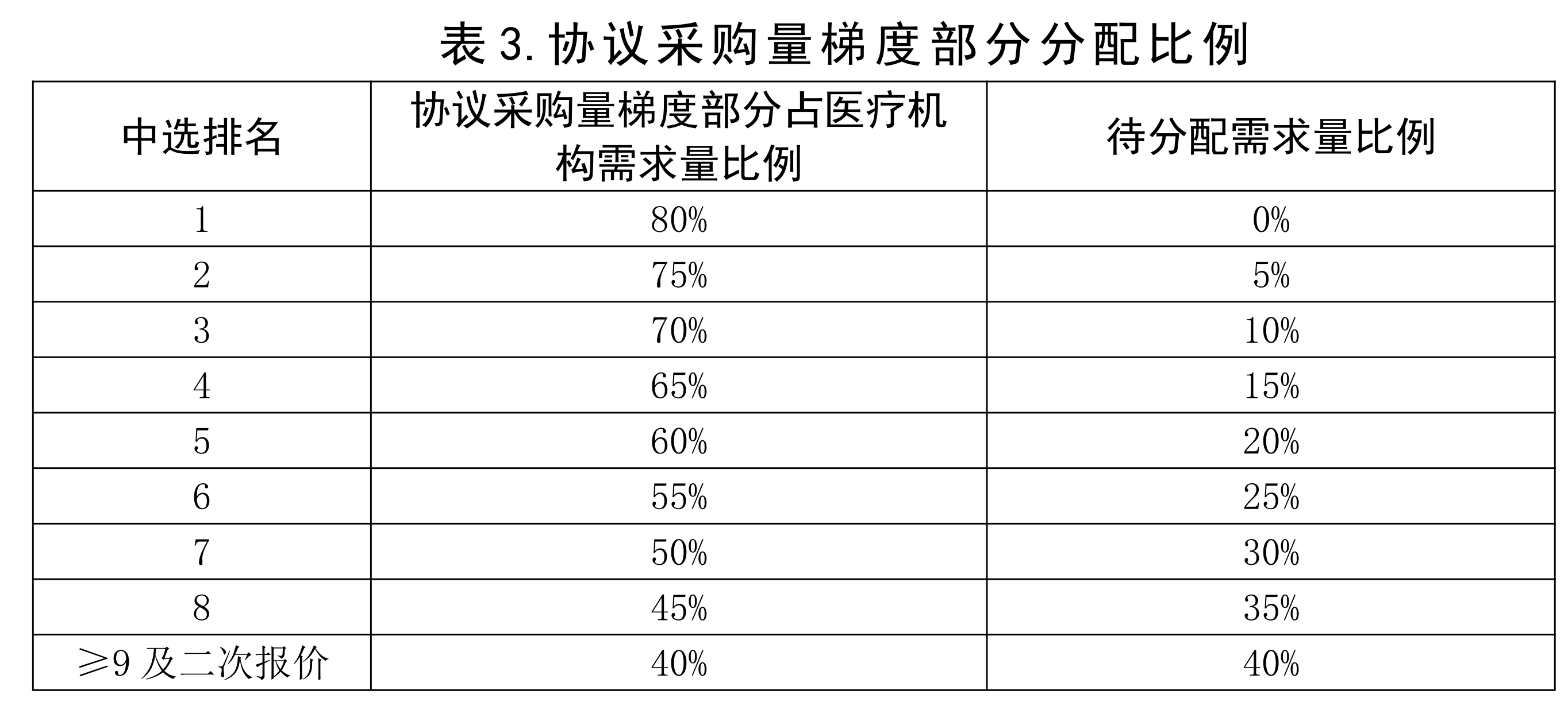 各競價單元通過“擬中選規則二和三”中選的企業,其協議采購量梯度部分占醫療機構采購需求量比例為 40%。