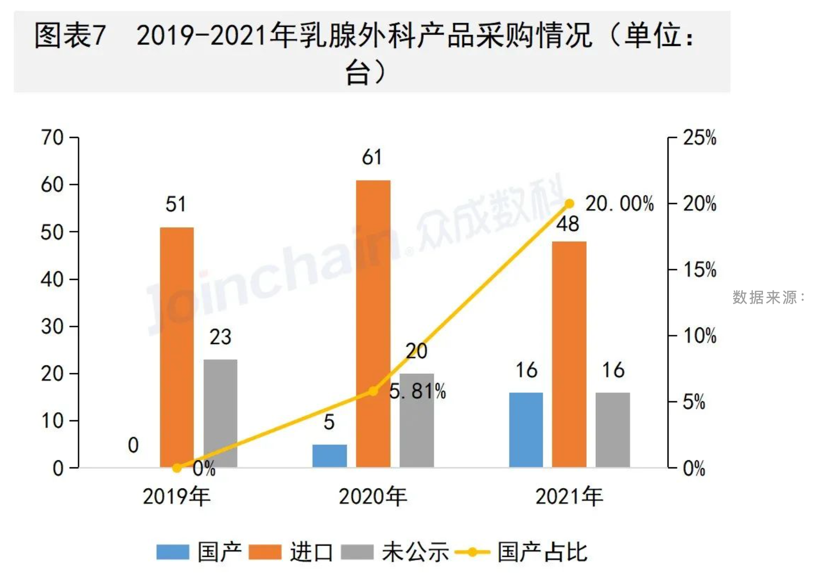 據眾成數科統計,2019-2021年國內醫院端手術動力裝置乳腺外科產品(乳房旋切與活檢系統)采購數量共計240件。近兩年,國產品牌開始發力,2020年國產產品實現零突破,2021年采購數量增加至16件,國產產品市場占比提升至20.00%。