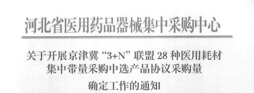 最新《通知》顯示,根據京津冀“3+N”聯盟采購辦公室工作安排,河北省各市組織轄區內相關醫療機構開展28種醫用耗材集中帶量采購中選產品協議采購量確定工作。