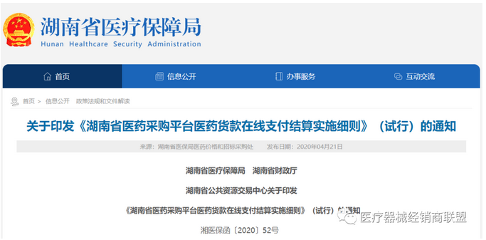 (4月21日),湖南省醫療保障局、湖南省財政廳以及湖南省公共資源交易中心聯合印發了《湖南省醫藥采購平臺醫藥貸款在線支付結算實施細則》(試行)的通知(以下簡稱《通知》)。