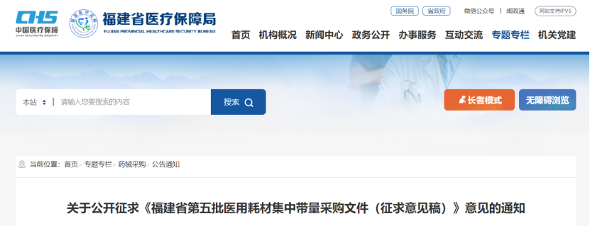 7月19日,福建醫(yī)保局發(fā)布《關(guān)于公開征求<福建省第五批醫(yī)用耗材集中帶量采購文件(征求意見稿)>意見的通知》(附文末)。