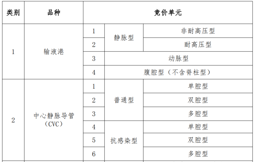 《征求意見稿》顯示,本次集中帶量采購品種為輸液港、CVC中心靜脈導(dǎo)管(經(jīng)中心靜脈路入)、PICC中心靜脈導(dǎo)管(經(jīng)外周靜脈路入)、造影導(dǎo)管、造影導(dǎo)絲、血管鞘、血管止血裝置等7類醫(yī)用耗材,競價單元劃分具體如下: