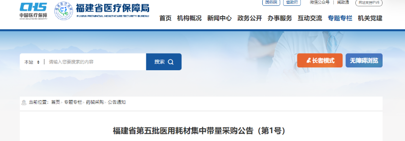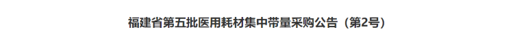 8月9日,福建省醫保局發布《福建省第五批醫用耗材集中帶量采購公告(第1號)》及《福建省第五批醫用耗材集中帶量采購公告(第2號)》(附文末)。