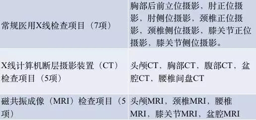首批試行醫學影像檢查資料共享的項目共17項,包括7項常規醫用X射線攝影、5項X線計算機斷層攝影裝置(CT)檢查項目和5項核磁共振成像(MRI)檢查項目,均為醫學影像學科最為常用、易于標準化、且有一定地方共享工作基礎的檢查項目。