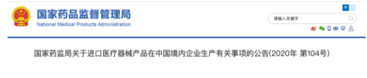 《關于進口醫療器械產品在中國境內企業生產有關事項的公告(2020年 第104號)》
