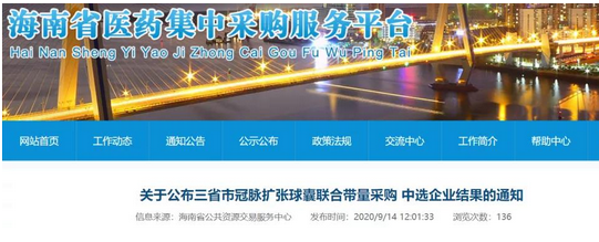 醫(yī)藥網(wǎng)9月16日訊 9月14日,海南省醫(yī)藥集中采購服務(wù)平臺發(fā)布《關(guān)于公布三省市冠脈擴張球囊聯(lián)合帶量采購中選企業(yè)結(jié)果的通知》,公布貴州省、重慶市、海南省三省市冠脈球囊聯(lián)合集中帶量采購中選企業(yè)結(jié)果。