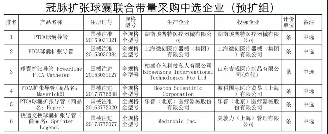 預擴組冠脈擴張球囊中選企業(yè)包括湖南埃普特、上海微創(chuàng)、吉威醫(yī)療、波科、樂普、美敦力。