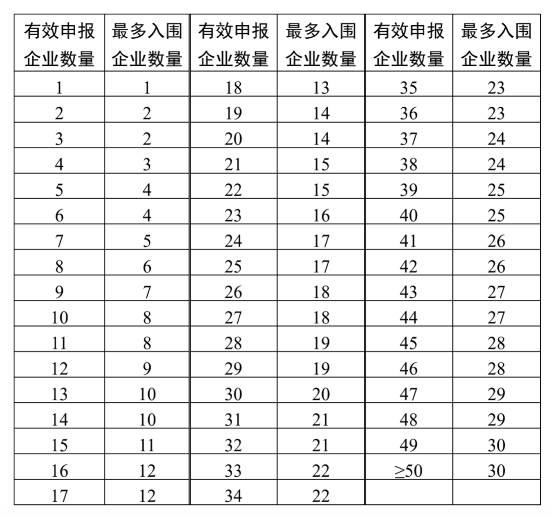 規則一:A、B 競價單元內,分別按有效申報企業競價比價價格由低到高排序,確定入圍企業。入圍企業的競價產品系統競價比價價格不高于相應最高有效申報價。最多入圍企業數量如下:
