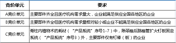 按照確保臨床使用和供應(yīng)穩(wěn)定、兼顧各類型產(chǎn)品和企業(yè)的原則,同一產(chǎn)品系統(tǒng)類別下,綜合考慮醫(yī)療機(jī)構(gòu)需求、企業(yè)供應(yīng)意愿和供應(yīng)能力、產(chǎn)品組合完整度等因素,將企業(yè)分單元分別競(jìng)價(jià),分為A、B、C三個(gè)競(jìng)價(jià)單元。與國(guó)采關(guān)節(jié)相比,多了一個(gè)競(jìng)價(jià)單元。