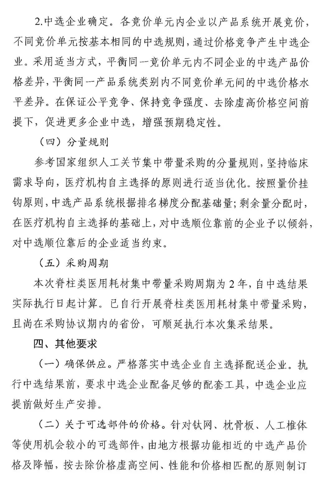 以不低于醫(yī)療機(jī)構(gòu)填報(bào)需求量的80%作為本次集采的意向采購(gòu)量,采購(gòu)周期2年。已自行開(kāi)展脊柱類醫(yī)用耗材集中帶量采購(gòu),且尚在采購(gòu)協(xié)議期內(nèi)的省份,可順延執(zhí)行本次集采結(jié)果。