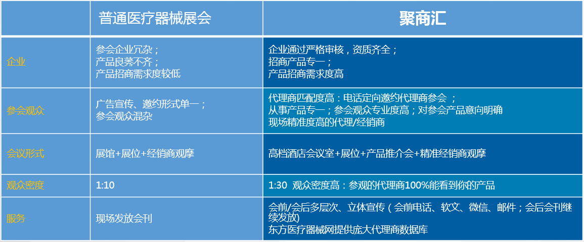 聚商匯是由東方醫(yī)療器械網(wǎng)(www.qxw18.com)運營的線下招商平臺,該平臺立足于為國內(nèi)醫(yī)械全行業(yè)生產(chǎn)/經(jīng)銷型企業(yè)產(chǎn)品招商,以及專業(yè)領(lǐng)域的品牌推介需求提供精準服務(wù)。