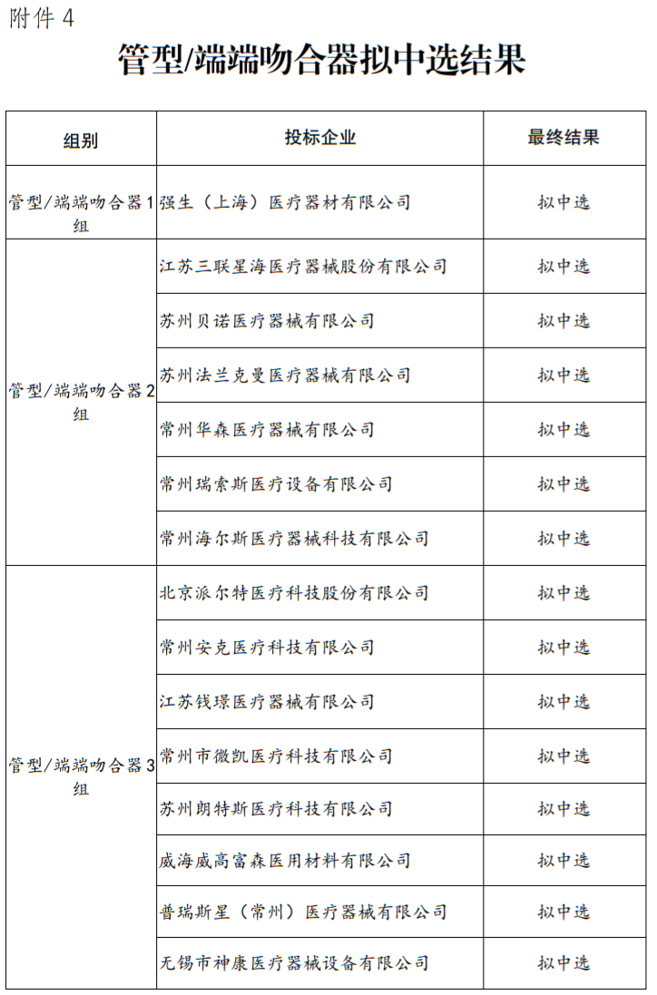 同是12月1日,江蘇省醫保局發布《關于江蘇省第四輪公立醫療機構醫用耗材聯盟帶量采購談判結果的公示》顯示(文末附擬中選械企名單):