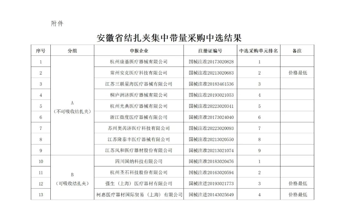 4月24日,安徽省黃山醫(yī)保局官網(wǎng)發(fā)布《關(guān)于公布安徽省結(jié)扎夾產(chǎn)品中選結(jié)果的通知》(簡稱《通知》),正式公布了安徽省結(jié)扎夾(包括不可吸收和可吸收)集中帶量采購中選結(jié)果。