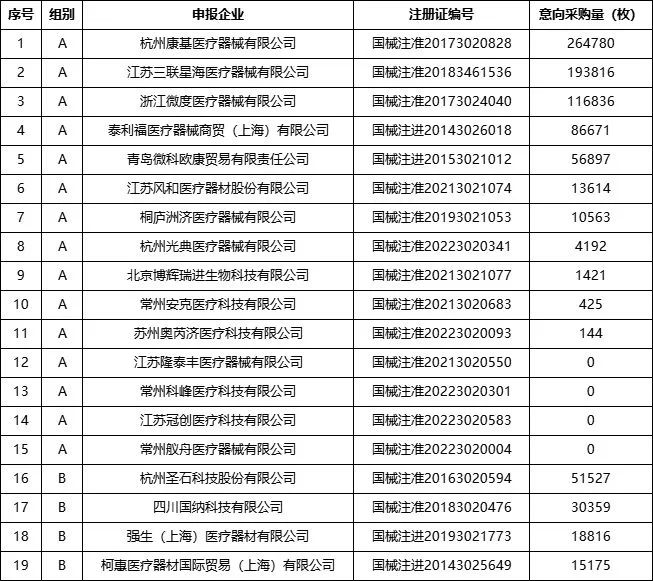意向采購量按參與本次集中帶量采購的醫(yī)療機構(gòu)報送的采購總需求量的80%累加得出。其中醫(yī)療機構(gòu)總需求量為1081538枚,首年意向采購總量為865236枚。