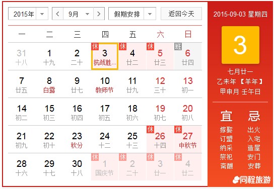 2015年北京華康普美科技有限公司,“抗戰勝利”假期為:9月3日(星期四)至9月5日(星期六)共放3天,9月6日(星期日)正常上班。
