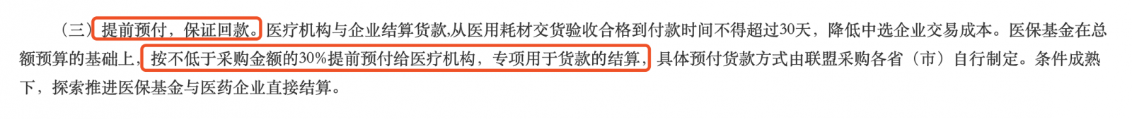 在回款上,醫療機構與企業結算貨款,從醫用耗材交貨驗收合格到付款時間不得超過30天,降低中選企業交易成本。醫保基金在總額預算的基礎上,按不低于采購金額的30%提前預付給醫療機構,專項用于貨款的結算,具體預付貨款方式由聯盟采購各省(市)自行制定。