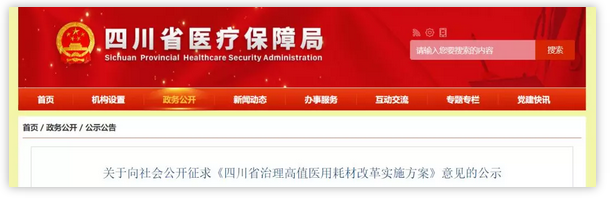 近日,四川省醫保局發布《關于向社會公開征求<四川省治理高值醫用耗材改革實施方案>意見的公示》(下稱《實施方案》)表示,將探索全省公立醫院兩票制。