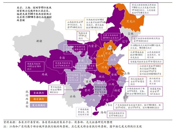光大證券也曾梳理全國耗材兩票制和耗材零加成的進展情況——截至2019年9月6日,全國有25省已開始或全面實施耗材兩票制。