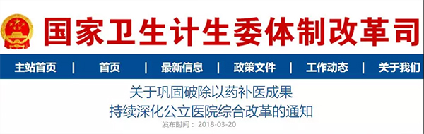 3月20日,國家衛計委官網刊出《關于鞏固破除以藥補醫成果持續深化公立醫院綜合改革的通知》(國衛體改發〔2018〕4號)。