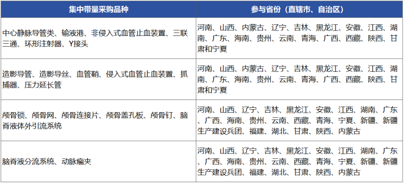 此次集采由河南省牽頭山西、內(nèi)蒙古、遼寧、吉林、黑龍江、安徽、福建、江西、湖北、湖南、廣東、廣西、海南、貴州、云南、西藏、陜西、甘肅、青海、寧夏、新疆和新疆生產(chǎn)建設(shè)兵團(tuán)等二十三個省(區(qū)、兵團(tuán)),組成省際采購聯(lián)盟,對通用介入類和神經(jīng)外科類醫(yī)用耗材開展帶量采購工作。