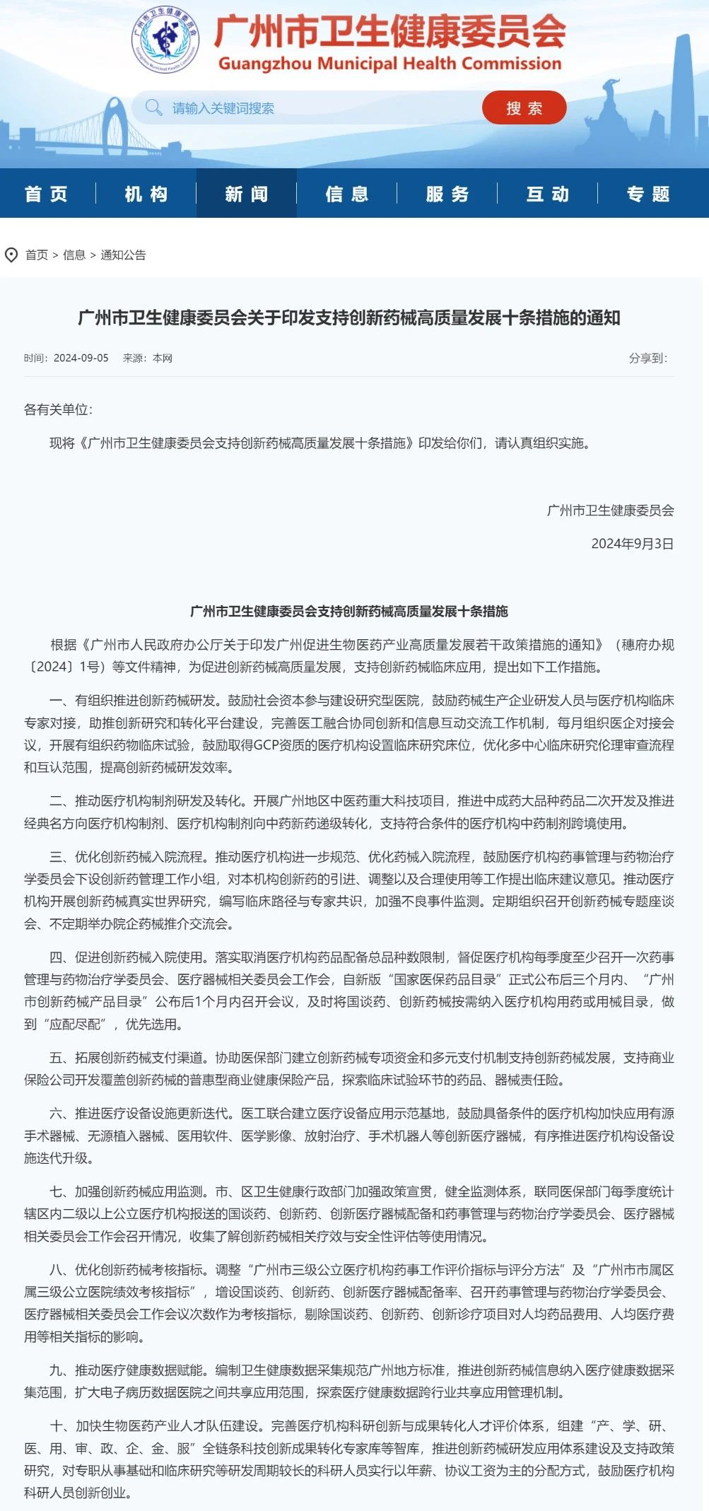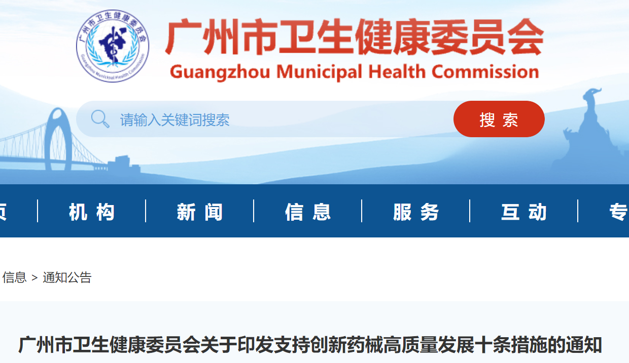 近日,廣東省廣州市衛健委發布《廣州市衛生健康委員會支持創新藥械高質量發展十條措施》,覆蓋產品研發-進院使用-支付拓寬全流程(完整見文末)。