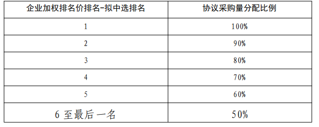 同分組企業加權排名價由小到大排序,梯度分配意向采購量,企業加權排名價相同排名并列且不占后續排名順序。具體規則如下: