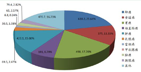 近些年來,肺癌的發病率逐漸升高。據統計,2015 年全球范圍內新增癌癥病例1410 萬,820 萬人死于癌癥,預計未來20 年新發病例數將增加70%。由于人口老齡化、不良生活習慣、環境污染和傳統手段治愈率較低等因素,我國已成為癌癥發病和死亡大國。據全國腫瘤登記中心統計顯示,2015 年中國癌癥新增429.16 萬例,死亡281.42 萬例。其中肺癌和胃癌高居發病和死亡前兩位。無論發病數還是死亡數,肺癌均排在惡性腫瘤第一位。