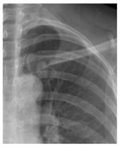 圖二 左鎖骨重疊致密結節,誤為衣服紐扣,病理肺腺癌