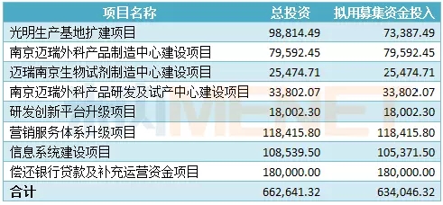 據招股說明書顯示,邁瑞醫療上述項目總投資額66.26億元,預計使用募集資金凈額63.40億元。本次募集資金投資項目將在現有主營業務的基礎上進行擴產,進一步突破現有產能瓶頸、改進生產工藝、豐富產品和提升產品質量,進一步提升公司的業務規模和市場地位;而擴建外科產品研發及試產中心、升級研發創新平臺,可提升技術開發實例,為公司的新產品研發提供更好的創新平臺;升級營銷服務體系、進行信息化系統建設等,有利于深挖市場、拓寬銷售渠道,推動公司持續健康的發展。