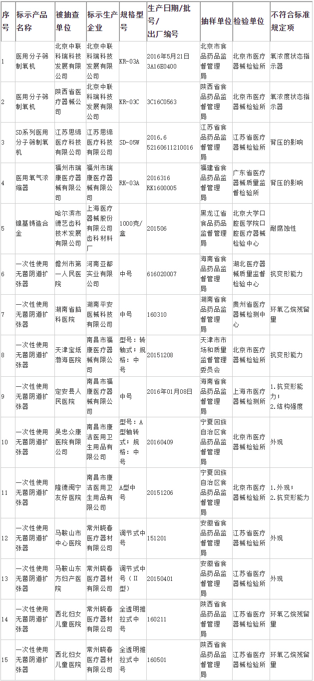 一、被抽檢項目不符合標準規定的醫療器械產品,涉及9家醫療器械生產企業的3個品種15批(臺)。具體為: