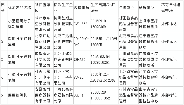 醫用氧氣濃縮器(醫用制氧機)5家企業5臺產品。杭州創威空分科技有限公司、北京廣達健翔科技有限公司、江蘇江航醫療設備有限公司生產的各1臺醫用分子篩制氧機,科邁(常州)電子有限公司生產的1臺小型分子篩制氧機、上海歐亮醫療器械有限公司生產的1臺醫用制氧機,外部標記不符合標準規定。