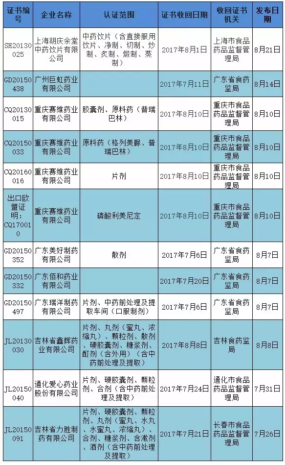 8月21日,上海市食藥監局發布《收回藥品GMP證書公告(2017年第1號)》。